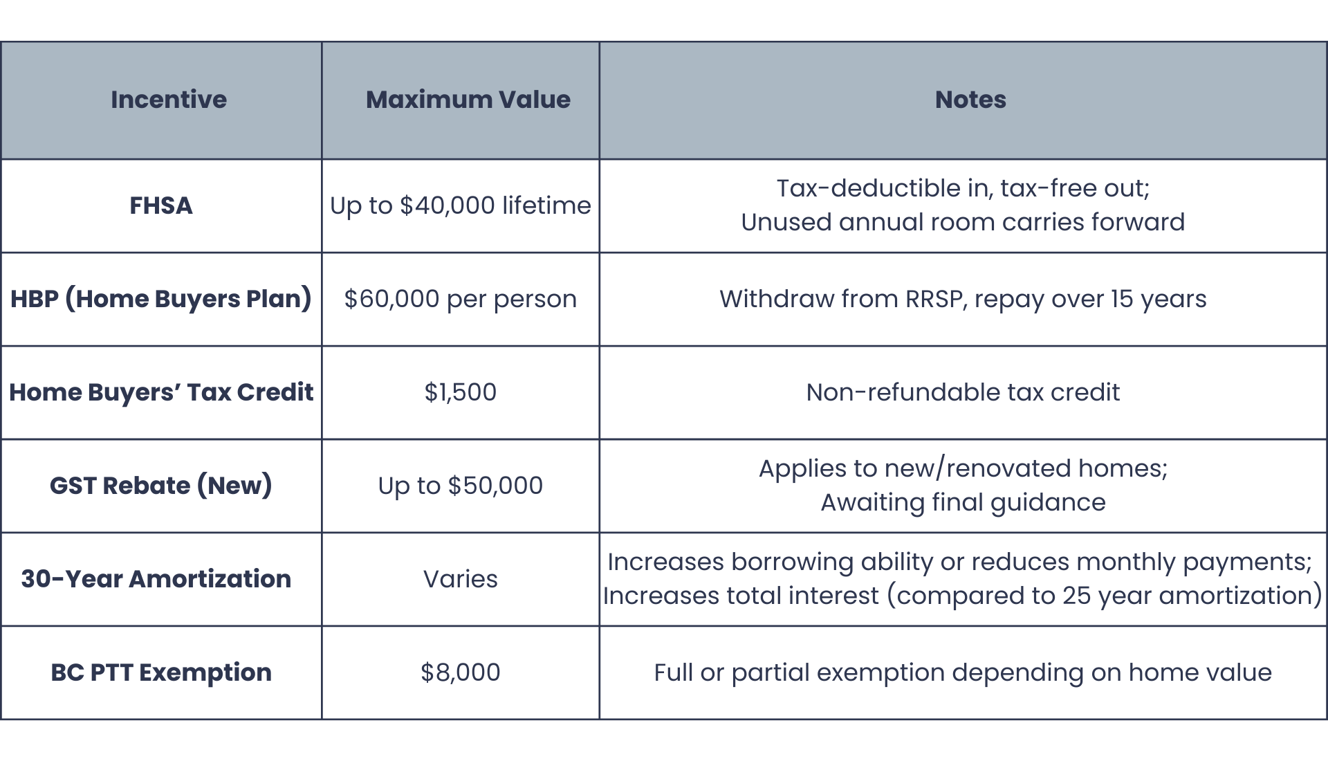 GST Rebate: A federal rebate for first-time buyers of new or substantially renovated homes, providing up to $50,000 back (pending government guidance).