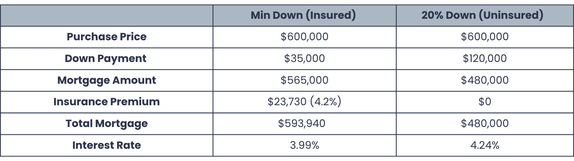 Let's say you're buying a $600,000 home. Here's how the costs compare between the minimum down payment for an insured mortgage and the minimum down payment for an uninsured mortgage: